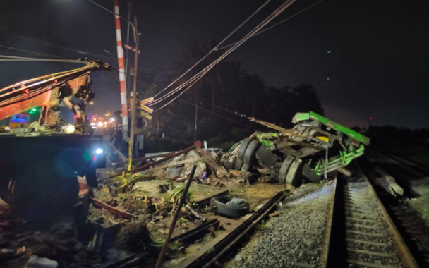 Kondisi truk tronton yang tertemper KA Gajayana di perlintasan sebidang JPL 582, petak jalan Prembun–Kutowinangun, Kebumen, Selasa (27/1/2026) malam. Insiden ini menyebabkan satu orang meninggal dunia dan puluhan perjalanan kereta api sempat mengalami keterlambatan. Foto: Nemukabar.com