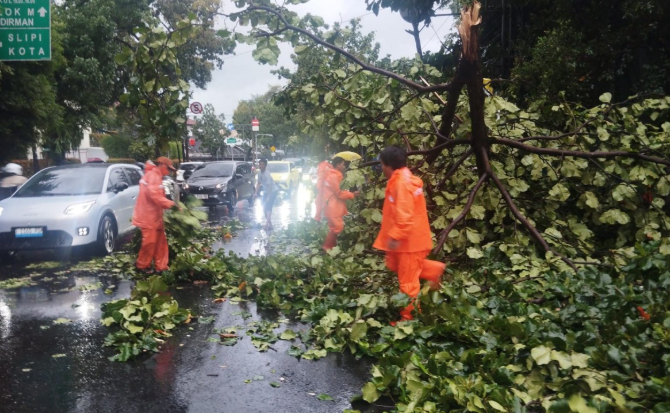 Batang pohon tumbang menutup sebagian akses Jalan Pakubuwono VI, Kelurahan Gunung, Kecamatan Kebayoran Baru, Jakarta Selatan, pada Senin pagi, 12 Januari 2026