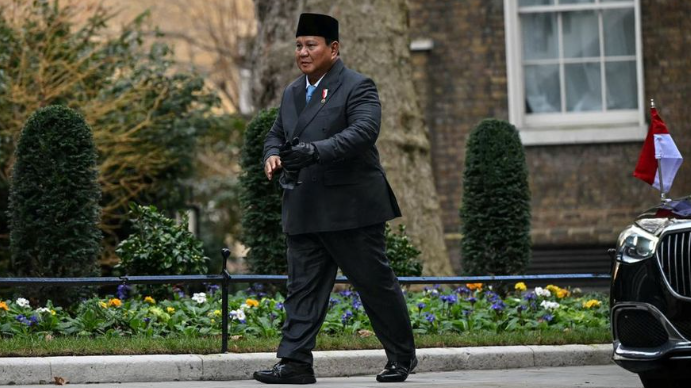 Presiden Indonesia Prabowo Subianto tiba di Perdana Menteri Inggris Keir Starmer di Downing Street, London tengah, Selasa (20/1/2026). (JUSTIN TALLIS/Pool via REUTERS)